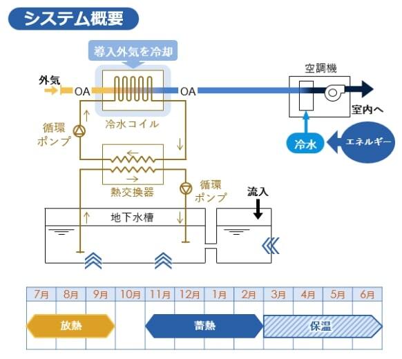 新鮮な外気を取り入れる際に、外気よりも低い温度となる地下水槽水を通過させて、暑い外気を冷やします。外気を冷やすことで、空気を冷やすためのエネルギーを削減することができます。